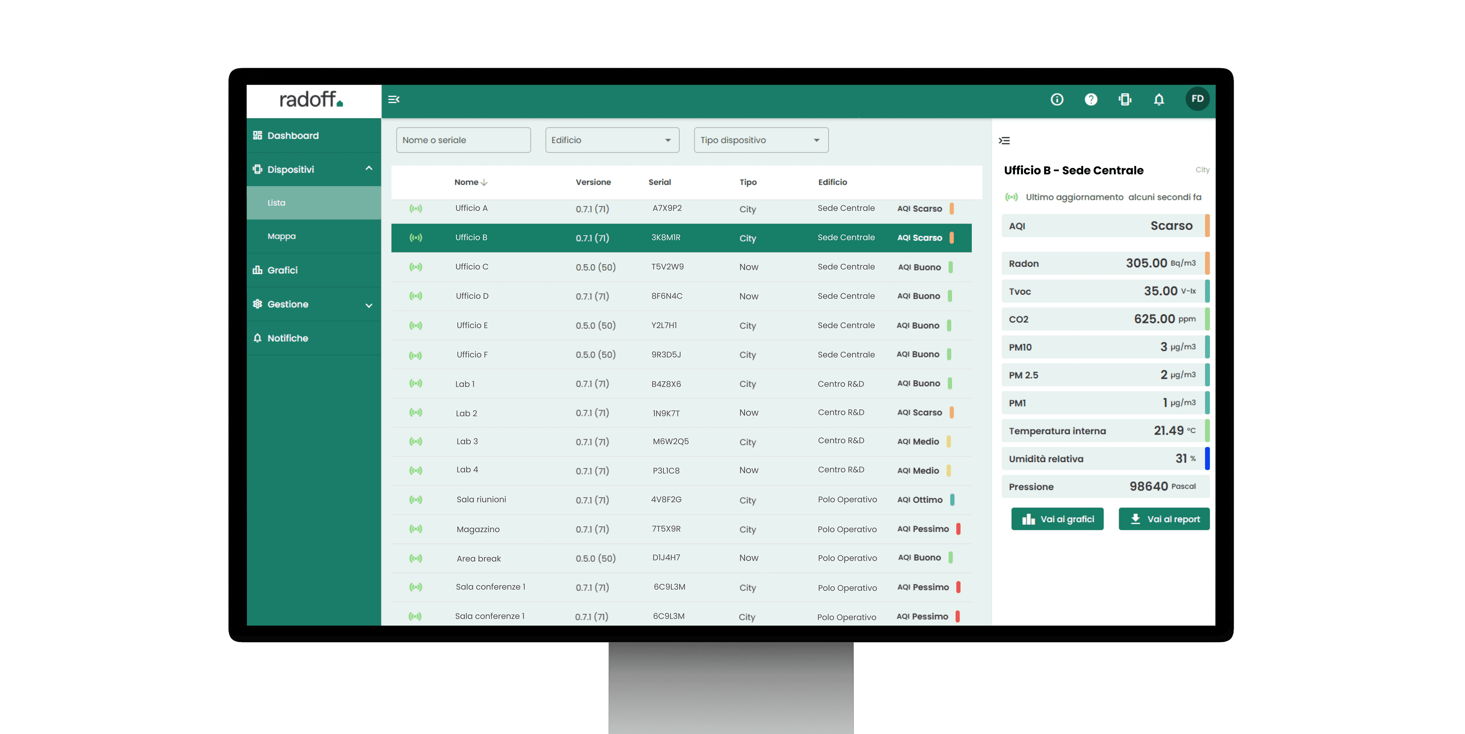 Radoff EOS va oltre il monitoraggio: la piattaforma integra sistemi hardware brevettati per intervenire attivamente sugli ambienti indoor e ridurre i rischi ambientali identificati dai dati.